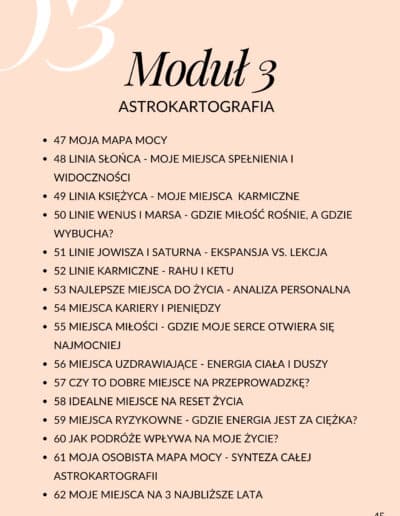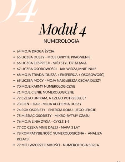 Podczas kursu Kronik Akaszy nauczysz się pracować z modlitwą i tworzyć własną świętą przestrzeń do duchowych odczytów. Poznasz sposób świadomego wypowiadania modlitwy otwierającej, tworzenia wersji z osobistym kodem dostępu oraz domykania sesji za pomocą modlitwy zamykającej. Równolegle poznasz techniki uziemienia, ćwiczenia oddechowe i inne praktyki, które wspierają Twoje ciało i system energetyczny w bezpiecznym otwieraniu się na przekazy z Kronik. Każdy moduł kursu zawiera transformujące ćwiczenia praktyczne – to nie jest sucha teoria, ale realna duchowa praca. Będziesz medytować ze swoim przewodnikiem duchowym, zadawać pytania i odczytywać odpowiedzi dla siebie i innych, oczyszczać wzorce finansowe oraz uzdrawiać wewnętrzne dziecko poprzez afirmacje i działania symboliczne.